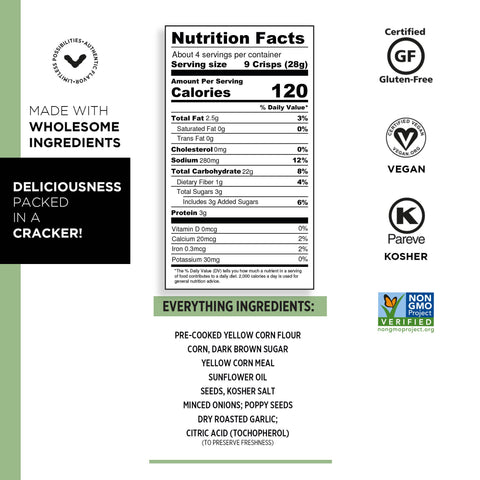 Craize Everything Toasted Corn Crackers are thin, crunchy crackers made from toasted corn and seasoned with the bold flavors of classic everything bagel seasoning. This savory blend of garlic, onion, sesame seeds, and poppy seeds pairs perfectly with the natural sweetness of corn, creating a rich and aromatic flavor.