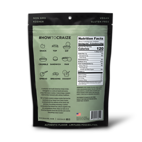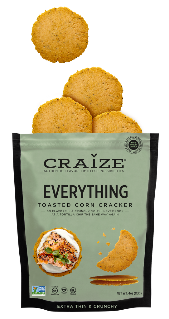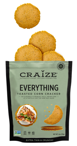 Made from corn, these crackers are naturally gluten-free and offer a light, crisp alternative to traditional wheat crackers. Inspired by the beloved everything bagel, they combine familiar seasoning with the signature crunch of Craize’s toasted corn crackers for a flavorful snack with a distinctive twist.
